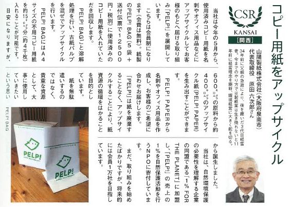 当社は今年の5月から使用済みコピー用紙を名刺やオフィス用品などにアップサイクルしてお客様のもとへ届ける取組み「PELP!」を展開しています。