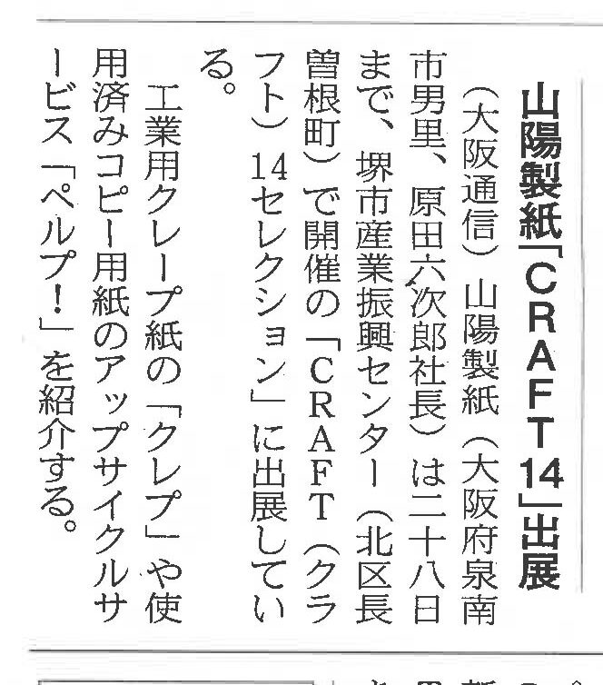 日刊紙業通信(令和3年3月4日)に掲載されました 2021.03.12 お知らせ 令和3年3月4日発行の日刊紙業通信に、山陽製紙が出展する「CRAFT14」が掲載されました。 この展示会では「crep」や「PELP!」を紹介します。