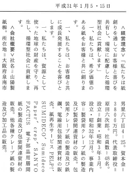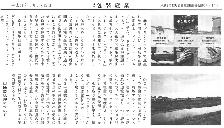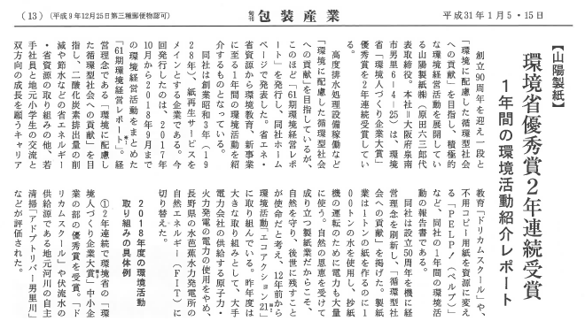 毎月5日と15日に発行している旬刊包装産業に山陽製紙が掲載されました。 製袋・コンテナバッグ業界専門紙となっており、(株)包装産業新聞が発行しています。 今回は、山陽製紙が環境省優秀賞を2年連続受賞したことについて、取り上げていただきました。
