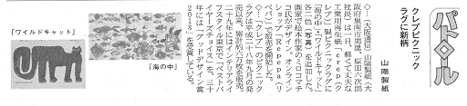 令和3年7月7日発行の日刊紙業通信に、ピクニックラグの新デザインが紹介されました。 今回は、画家で絵本作家のミロコマチコさんに「海の中」と「ワイルドキャット」を各2色ずつデザインしていただきました。 海の中 ワイルドキャット